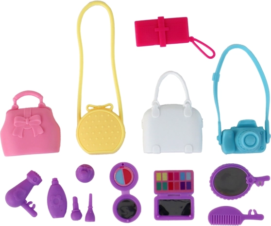 - Dukke i kjole, tilbehør til makeup og frisurer, 5 håndtasker