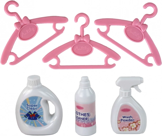 Dette rige sæt giver børn mulighed for at efterligne rigtig tøjvask – fra at sortere tøjet, lægge det i maskinen til at hænge det på bøjler. ANLILY-dukken i sød pink-blå kjole har langt blond hår, der kan børstes og styles i forskellige frisurer.