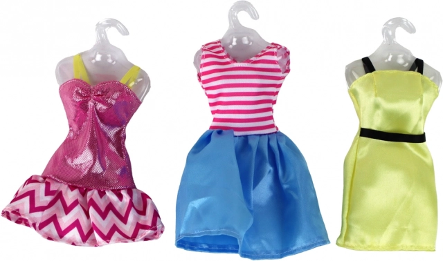 - Mode-sjov: 3 forskellige kjoler til omklædning af dukken og 3 bøjler til tørring.