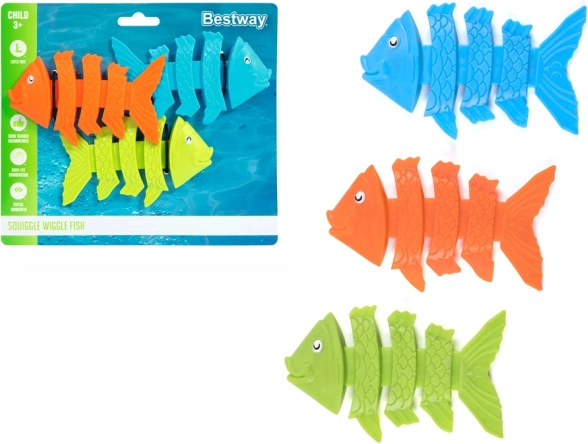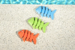 Sæt af sjove dykkerfisk lader dig forvandle hver svømmetur til et eventyr. Tre farverige fisk (orange, grøn og blå) er designet til at synke til bunden og opfordre børn til at dykke. Legen hjælper dem med at udvikle bevægelseskoordination og forbedre svømmefærdigheder.