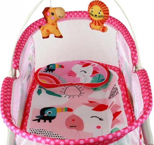 Den multifunktionelle baby seng med vugge 2i1 tilbyder ikke kun en komfortabel soveplads, men også en underlag og vugge i ét. Den pink farve skaber en venlig atmosfære for børn, og takket være nettet og baldakinen beskytter den barnet mod insekter og solen, hvilket giver mulighed for fredelig søvn i det fri. Muligheden for at omdanne vuggen til en stabil seng ved udfoldning af benene giver yderligere fleksibilitet.