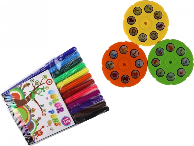 Pakken indeholder 3 projektionsskiver med forskellige billeder, 12 farvede tuscher, notesblok og en praktisk underlag–organizer, der holder alle dele samlet. Legetøjet styrker finmotorikken, træner fantasien og lærer børn om dyr gennem leg.