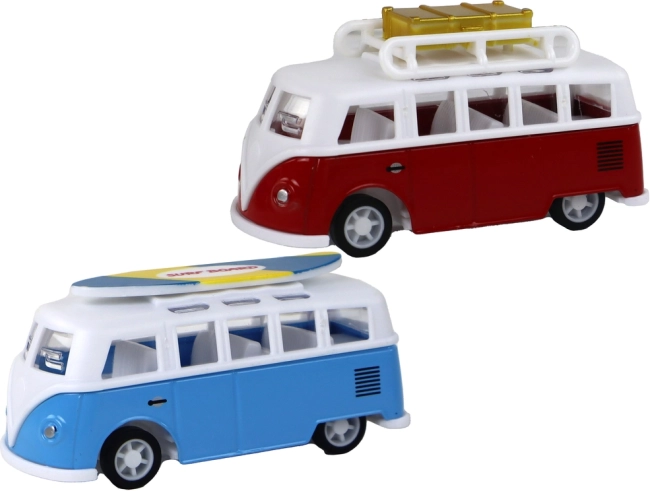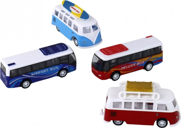 I pakken finder du 2 campere (rød og blå) og 2 busser (blå “Airport Bus” og rød “Deluxe Bus”) suppleret med trafikskilte. Den robuste udførelse og de realistiske detaljer (vinduer, sæder, tagbøjle eller surfbræt) gør sættet til en perfekt gave til små køretøjsentusiaster.