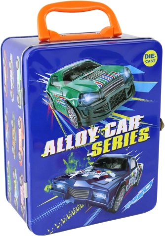 Medfølger en stilfuld blik-kuffert med sportsbilmotiv, metallukning og nedfældeligt håndtag. Indeni finder du overskuelige bokse til sikker opbevaring af biler – perfekt til små samlere på rejse og på værelset.