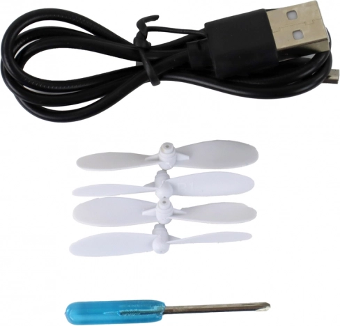 - Fly, fjernbetjening, batteri, USB-opladningskabel, 4 reservepropeller, manual