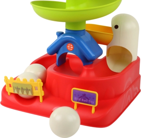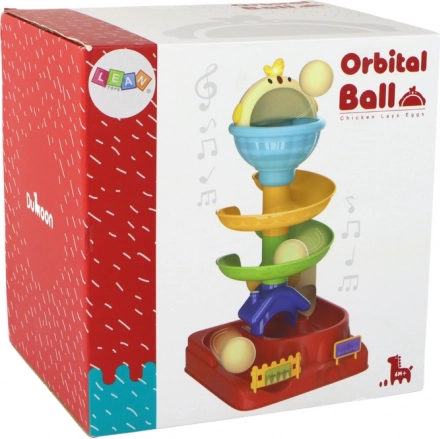 Denne interaktive kuglebane byder på en farverig bane, cirka 36 cm høj, hvor kugler formet som æg ruller ned. Kyllingen på toppen tilfører lyde, der vækker nysgerrighed og fremmer kognitive færdigheder.