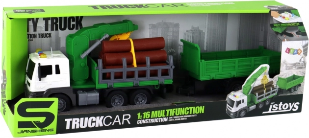 Grøn skovbrugslastbil med kran 1:16 med lyde og friktionsmotor. Funktionel kran, trailer og gummihjul. Fantastisk legetøj til børn fra 3 år.