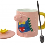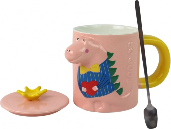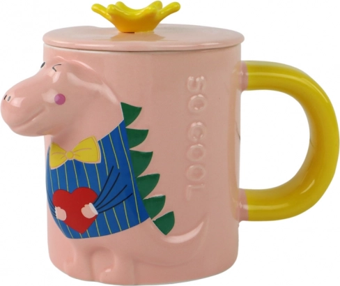 Dette stilfulde keramikkrus kombinerer funktionalitet og legende design. Den lyserøde krop med gult håndtag komplimenteres af et låg med gul krone, som beskytter drikken og fuldender det originale udtryk. Det reliefprægede 3D-dinosaurusmotiv giver glæde ved hver slurk – ideelt til kaffe, te og kakao.