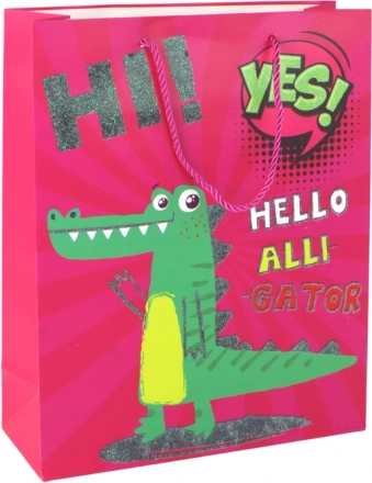 Krokodilledekoren med subtil glimmer virker venlig og fanger blikket med det samme. De flettede lyserøde håndtag er behagelige at holde i og bevarer formen. Posen er fremstillet af kvalitets papir/karton og er et mere miljøvenligt alternativ til plastemballage.