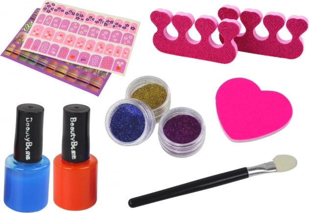 - 3× glitter (pink, guld, blå), 2× lak (blå, orange), 2× neglefil (klassisk, hjerteformet), 2× separator, sæt klistermærker, glitterapplikator