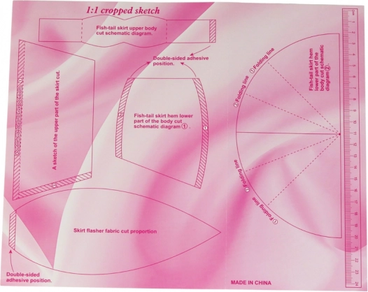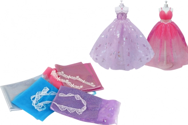 - 5 forskellige stoffer til kjoler; 2 kjolestander; farvede og sølvfarvede pailletter; bånd; tråd; farve-/materialevifte; skabelon med mål; vejledning