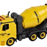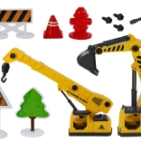 - Grundkøretøj, karrosseri- og cockpitdele, dele til at bygge gravko, betonblander og kran, skruer, skruetrækker med udskiftelige bits, tilbehør (skilte, træ, brandhane, kegle)