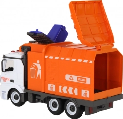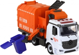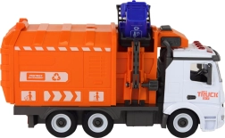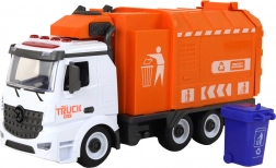 Dette realistiske skraldebil-sæt giver børn timevis af kreativ leg. Den orange-hvide bil med funktionel holder til spanden simulerer affaldsindsamling troværdigt. Friktionsdrevet aktiveres ved at skubbe den på en plan overflade, og bilen kører selv afsted. Lys og lyde øger autenticiteten i legen.