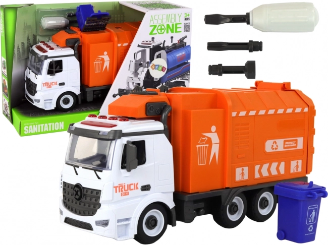 Oplev et sjovt byggesæt af en skraldebil i orange-hvid med lys- og lydeffekter. Med den medfølgende skruetrækker kan børn skille bilen ad og samle den igen, hvilket styrker finmotorik og tekniske færdigheder. Sættet indeholder også en blå affaldsspand, der kan løftes og tømmes – ideelt til leg med sortering og genbrug. Bilen har friktionsdrev, lys- og lydeffekter og praktisk DIY-montage til små konstruktører.