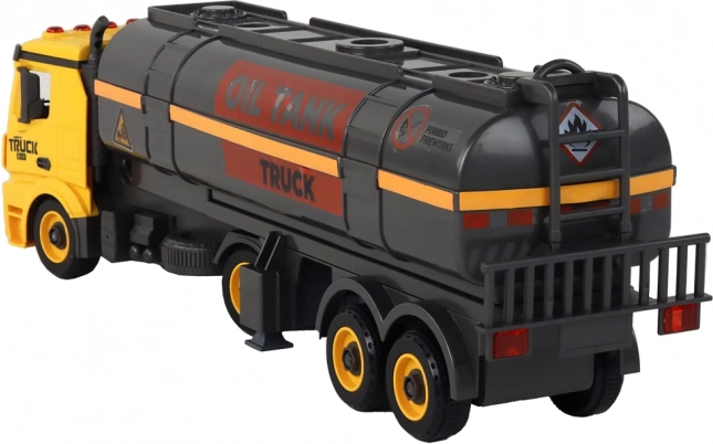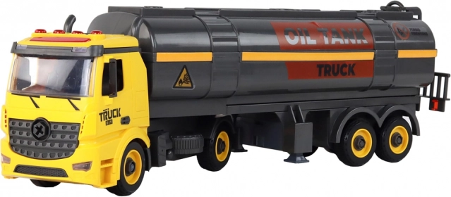 Kvalitetsplast, gul-grå udførelse og detaljeret bearbejdning af tank og kabine gør tankbilen til en yndlingslegeting i lang tid.
