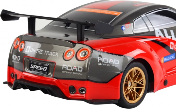 Det realistiske udseende med rød karrosseri og gyldne fælge understreges af lyseffekter, som især kommer til sin ret ved kørsel i skumringen. Med et genopladeligt 7,4 V batteri og USB-opladningskabel kan du hurtigt komme tilbage på banen.