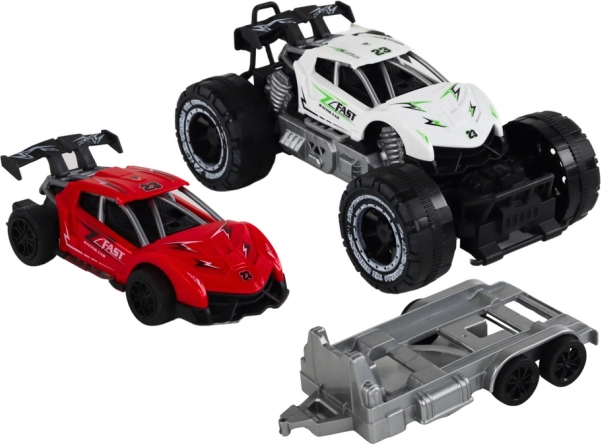 Dette legetøjssæt indeholder en hvid offroad-bil og en rød sportsvogn placeret på en trailer, hvilket fremmer kreativitet og fantasi under legen. Børn kan finde på deres egne historier fulde af løb og eventyr i vildt terræn. Traileren kan nemt frakobles, hvilket giver nye muligheder for kombinationer og legescenarier.