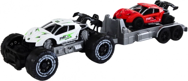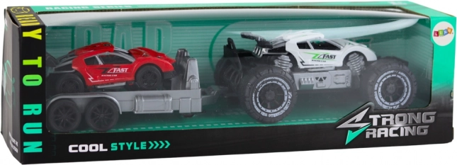 Offroad-bil og rød sportsvogn på trailer er et fantastisk legetøjssæt for børn, der elsker bil-eventyr. Med robuste hjul og solid konstruktion er det klar til enhver terrænudfordring.