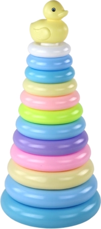 Denne lærerige stablepyramide i pastelfarver motiverer børn til at sortere og sætte 12 ringe på fra størst til mindst. Den legende læring styrker finmotorikken, hånd-øje-koordinationen, tålmodigheden og fantasien. Toppen prydes af en sød lille and, som indbyder til mere leg.