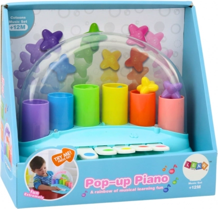 Det blå klaver med pop-op-stjerner er et usædvanligt legetøj, der inviterer de mindste ind i en magisk verden af musik og lys. Dette klaver, designet med fokus på barnets sikkerhed og udvikling, byder ikke kun på lyde, men også visuelle effekter i form af farverige stjerner, der springer op ved hvert tangenttryk.