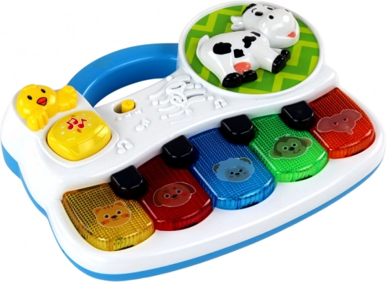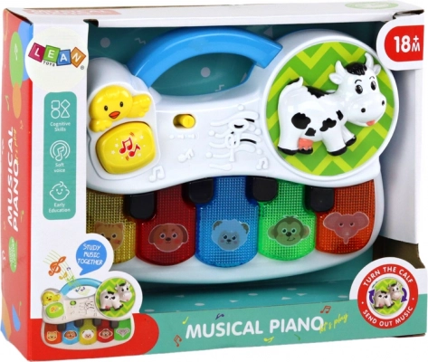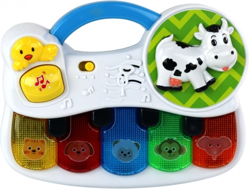 Opdag musikkens verden med dette kompakte klaver til de mindste. Det byder på 5 farvede tangenter med dyremotiver, lyseffekter og lyde, der stimulerer barnets sanser. Ved tryk på den gule knap afspilles en glad melodi, og den roterende ko-figur fanger interessen og underholder. Ideelt til at udvikle finmotorik, høresans og fantasi.