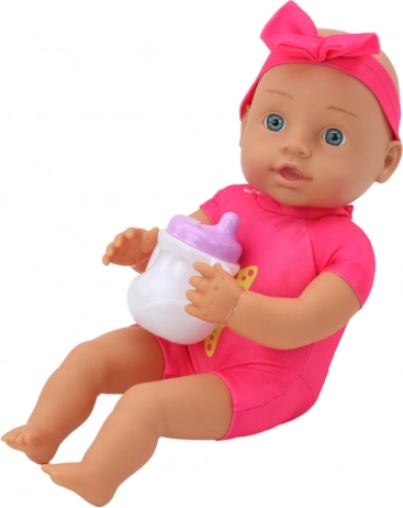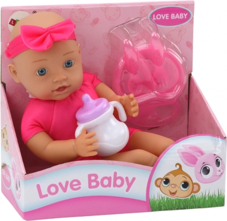 Denne babydukke i lyserødt tøj er ideel til den første rolleleg. Med de medfølgende tilbehør – skål med ske og gaffel samt flaske – kan børn efterligne fodring og daglig pleje. Et godt valg til udvikling af finmotorik og sociale færdigheder.