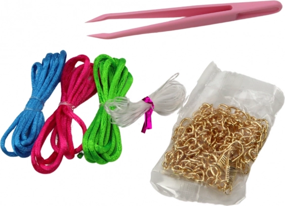 Takket være de farvede snore (lyserød, grøn, blå), fiskesnøre og tilbehør kan børn designe smykker til forskellige lejligheder. Sættet indeholder også søde hårelastikker og hårspænder samt clip-on øreringe – velegnet selv til børn uden huller i ørene.