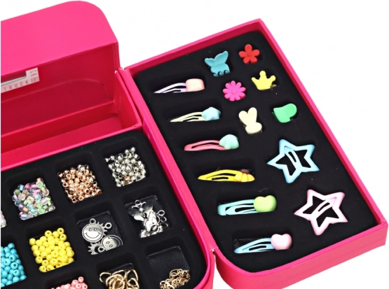 Dette veludstyrede sæt fremmer kreativitet, finmotorik og æstetisk sans. Indeni finder du en farverig blanding af perler, vedhæng og komponenter til at lave originale armbånd og accessories. Smykkeskrinet med integreret spejl og rum holder alt pænt organiseret.