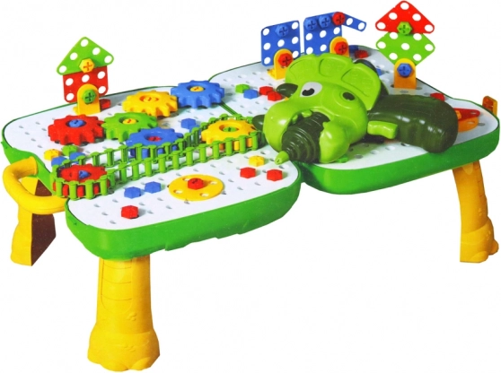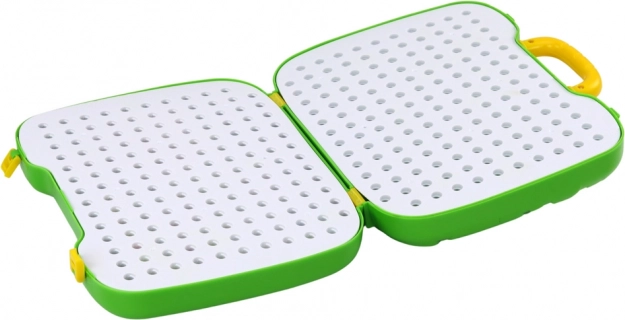 Takket være de tandhjul kan børn eksperimentere med simple mekanismer og udvikle teknisk tænkning. Sættet er designet til at styrke hånd–øje-koordination, tålmodighed og fantasi. Alt ryddes nemt tilbage i de lette og robuste grøn-hvide foldbare plader/kuffert med håndtag.