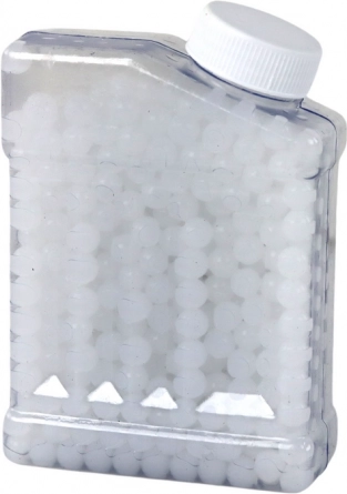 Kuglerne er opbevaret i en praktisk plastbeholder for nem opbevaring, transport og påfyldning af pistoltank.