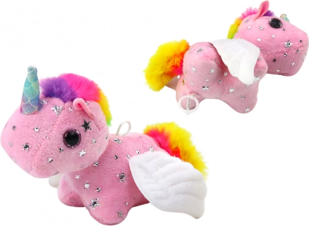 Den plyssede enhjørning er et fortryllende legetøj, der tager børn med ind i en magisk verden. Takket være den træk-op snor hopper enhjørningen glad og vifter med halen, når den slippes, hvilket gør legen endnu sjovere. Den bløde lyserøde pels med sølvstjerner, den farverige manke og de hvide vinger giver legetøjet et magisk udtryk.