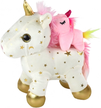 Den hvide enhjørning med gyldne stjerner, lyserød manke og gyldne hove er silkeblød at røre ved og indbyder til kram.