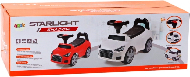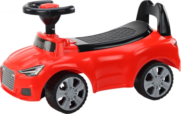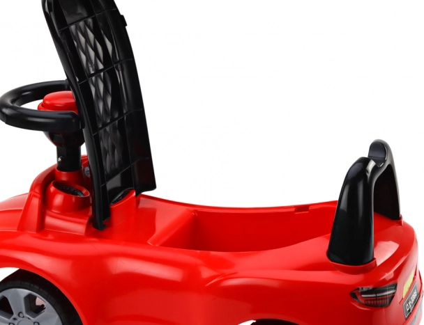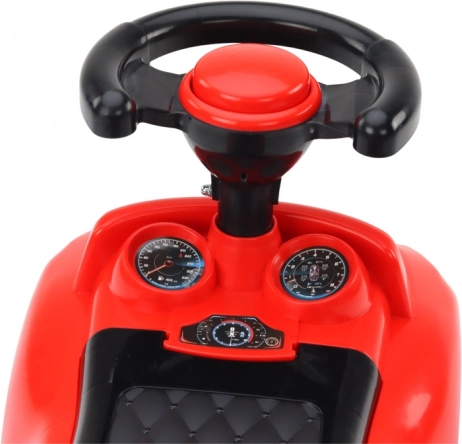 Rattet med horn stimulerer den lille chaufførs fantasi, og den bageste stabiliserende støtte forhindrer at vælte bagover. Under det sorte sæde er der en opbevaringsboks til småting, hvor barnet kan lægge yndlingslegetøj til turen. Gåbilen er perfekt til de første køreture, læring af retning, afstands- og hastighedsbedømmelse og hjælper barnet med at blive mere sikkert på benene.