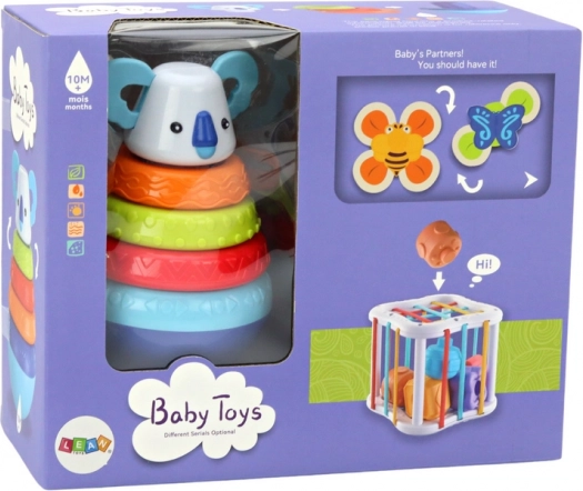 Sættet indeholder tre forskellige elementer, hvoraf hvert giver barnet unikke oplevelser og udfordringer. Tårnsorteren med koalahjul hjælper ikke kun barnet med at udvikle finmotorikken ved at placere hjulene de rigtige steder, men giver også underholdning takket være koalaens vuggende bevægelse.