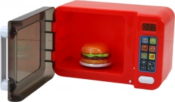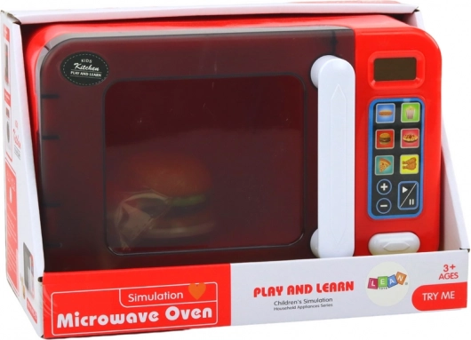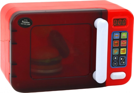Interaktiv børnemikroovn i rød, der forvandler køkkenlegen til en realistisk oplevelse. Den tilbyder lyseffekter, roterende tallerken, åbnelåge og opvarmningsprogrammer. Inkluderer tilbehør – hamburger, pommes frites og hotdog. Sikker leg for børn fra 3 år, drevet af 3× AA (medfølger i pakken).