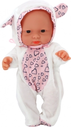 Den hvide dragt med hjerteprint og hætte med ører giver dukken et unikt, blidt udseende, som børn elsker.