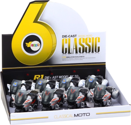 Fås i to varianter – politi og sport. Vælg venligst model før køb. De enkelte legetøj er pakket separat, men der er 8 stk. i kassen. Motorcyklens mål er 17 cm x 10,5 cm x 8 cm. Legetøjet er CE-certificeret og opfylder EN71-standarderne. Velegnet til børn fra 3 år.