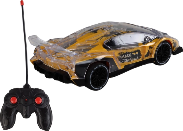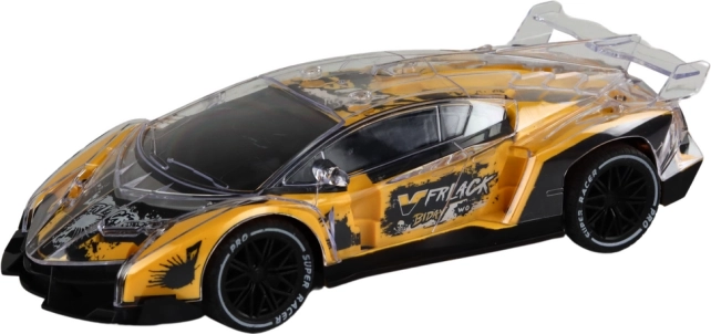 Oplev glæden ved høj fart med den gule RC-bil, som kombinerer et attraktivt design og imponerende lyseffekter. Takket være den gennemsigtige øverste del af karrosseriet spredes lyset og skaber et imponerende show ved hver kørsel. Bilen tilbyder glat styring og sjov for både små og store motorentusiaster.