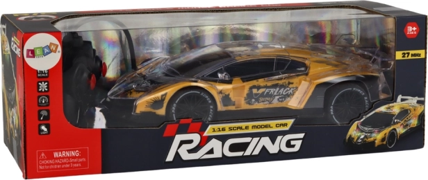 Gul RC sportsvogn i skala 1:16 giver stor underholdning for både børn og voksne. Den skiller sig ud med intens gul farve, gennemsigtigt dæksel med farverige lyseffekter og intuitiv fjernbetjening til præcise manøvrer. Ideel til de første “racerbaner” og udvikling af koordination.