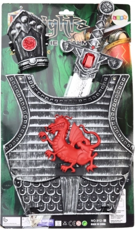 - Komplet sæt: rustning, benskinne og sværd til fuldendt leg.