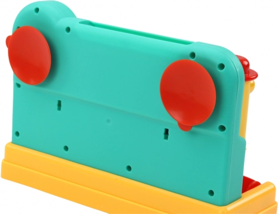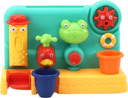 Dette farverige badelegetøj forvandler hvert bad til et glædeligt eventyr. Vand hældt i den øverste åbning udløser en kaskade af effekter: det drejer vandhjulet, løber ud af hanen, skaber en fontæne, og ved et tryk på knappen strømmer vand ud af den søde frøs mund. Takket være de pålidelige sugekopper kan legetøjet nemt fastgøres på glatte overflader.