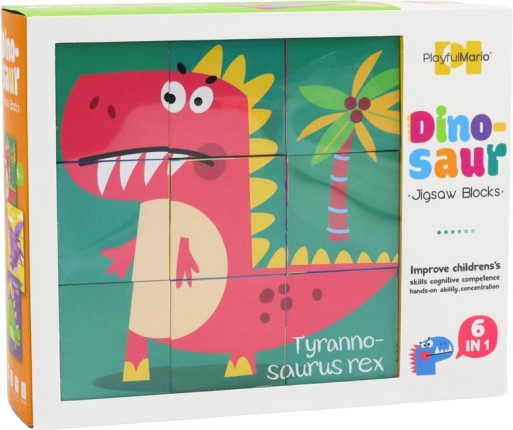 Farverige, pædagogiske klodser med dinosaurmotiver tilbyder op til 6 forskellige billeder i 1 sæt. Af 9 solide klodser kan børn lægge T-REX, PTEROSAURUS, TRICERATOPS, STEGOSAURUS, DIPLODOCUS og SPINOSAURUS. Legen understøtter finmotorik, hånd-øje-koordination og logisk tænkning. Velegnet fra 3 år, fremstillet af holdbart karton, med CE og EN71.