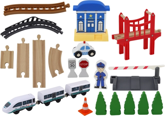 Denne kvalitets trætogbane åbner for en verden af jernbaneeventyr for børn. Med det rige tilbehør – inklusive bro, politistation, bom, STOP-skilt og politibetjent-figur – kan de skabe deres egne historier og udvikle kreativiteten. De stabile træskinner gør det muligt at bygge forskellige baner med en samlet længde på op til 3,2 m.