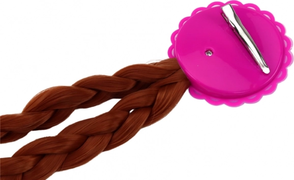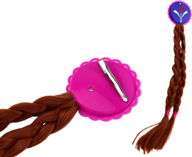 Først har vi en smuk hårspænde med to lange fletninger, som giver charme og elegance til enhver frisure. En lyserød handske pyntet med blå glimmer, der giver et usædvanligt skær, så din lille prinsesse stråler til enhver fest.