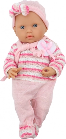 En fortryllende babydukke i en pink stribet sweater med hue og halstørklæde vil glæde enhver lille omsorgsperson. Den har realistiske træk og bevægelige arme og ben og er fremstillet af sikre og holdbare materialer. Dukkens mål 39 × 18 × 10,5 cm, alder 18+ måneder, certificering CE og EN 71.