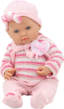 Det praktiske sæt tøj omfatter en stribet pink-hvid sweater, en hue med sløjfe og et halstørklæde, som giver dukken et blidt udtryk. Dukken er et godt valg som den første dukke fra 18 måneder og opfylder de strenge CE- og EN 71-standarder.
