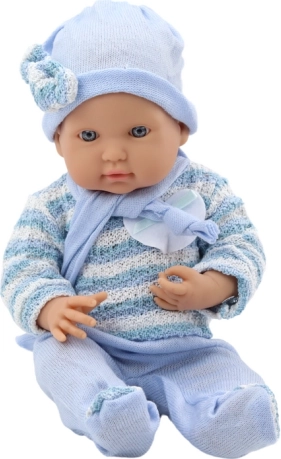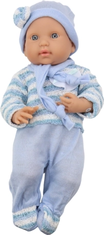 Sød babydukke i blåstribet sweater med hue og halstørklæde, der vil glæde enhver lille omsorgsperson. Den byder på realistisk udformning, bevægelige arme og ben samt bløde strikkede outfits af sikre materialer. Ideel legetøj til børn fra 18 måneder.
