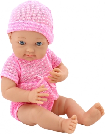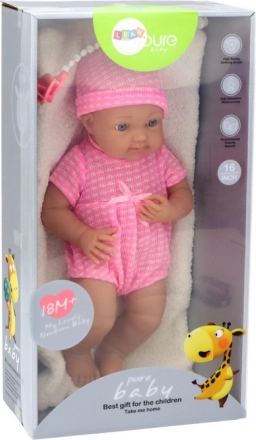 Denne babydukke giver børn masser af blid leg og øvelse i omsorg. Den lyserøde body med lille sløjfe og matchende hue understreger dens charme, mens realistiske ansigtstræk og bevægelige lemmer understøtter kreativ, efterlignende leg. Medfølger sut på snor og blødt tæppe til trøst og putning.