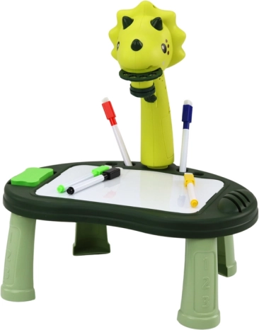Støt børns kreativitet med dette sjove 2-i-1 sæt: en dinosaurprojektor til tegning og et aktivitetsbord suppleret med de klassiske spil Ludo og Slanger og Stiger. Det søde grønne design, 24 skabeloner til nem optegning, vaskbare tuscher og en hvid tavle gør sættet til et fantastisk redskab til udvikling af fantasi, finmotorik og koncentration. Velegnet til børn fra 3 år med CE-certificering og overensstemmelse med EN71.