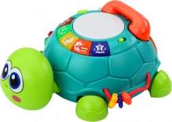 Den interaktive tromme på skildpaddens ryg med lys-effekter bidrager til sensoriske oplevelser og giver ekstra sjov og kreativitet. En knap formet som en skildpadde ved siden af trommen aktiverer skildpaddens bevægelse, hvilket fremmer børns fantasi og motorik.